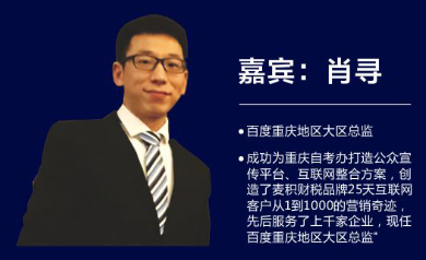 本次峰會特邀 肖尋 嘉賓主講,他成功為重慶自考辦打造公眾宣傳平臺、互聯(lián)網(wǎng)整合方案,是創(chuàng)造了麥積財稅25天互聯(lián)網(wǎng)客戶從1到1000的營銷奇跡者之一,先后服務(wù)了上千家企業(yè),現(xiàn)任百度重慶地區(qū)大區(qū)總監(jiān)。