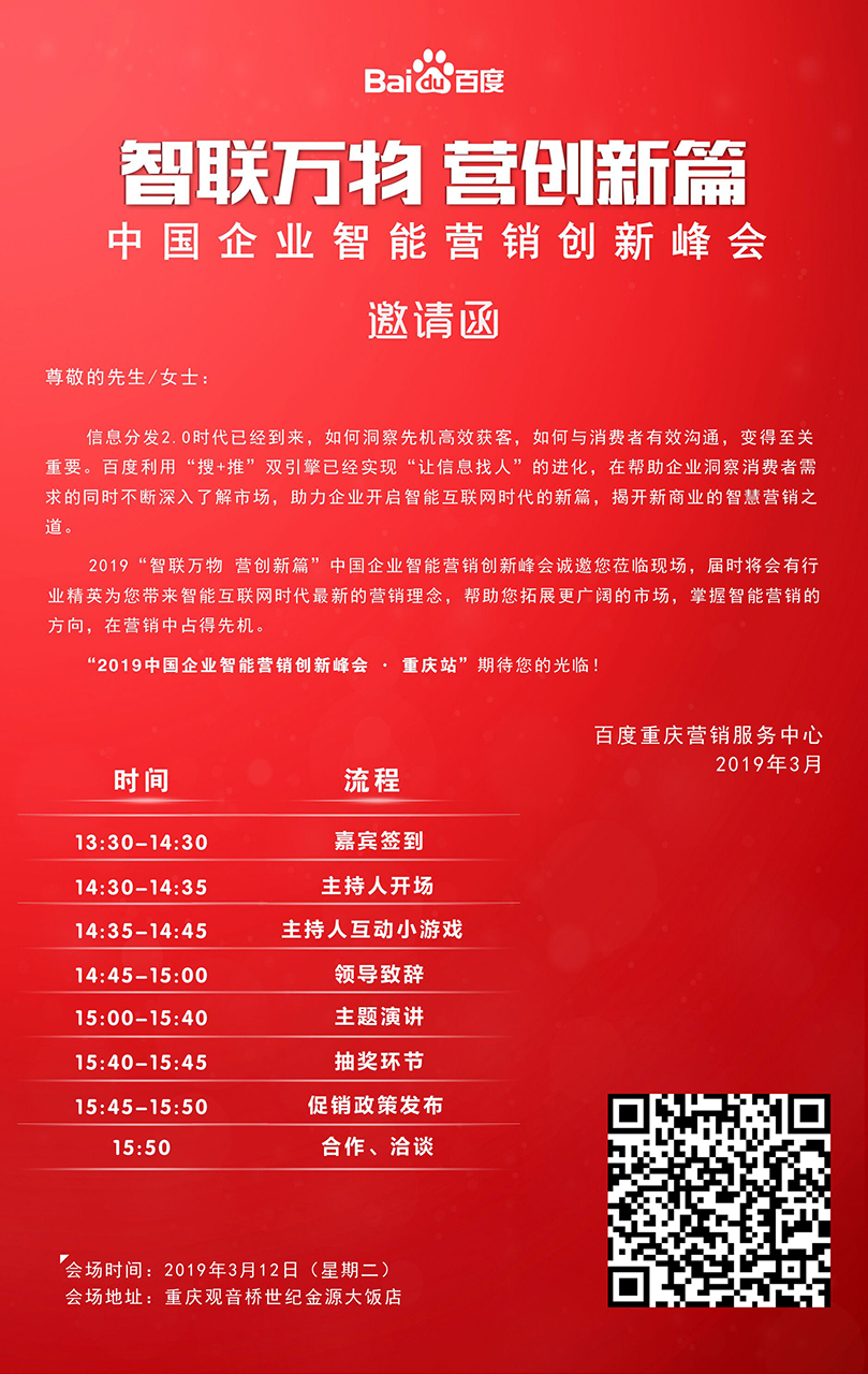 上一篇:2019百度城市大會—重慶站,AI助力,渝您同行 下一篇:2019中國企業(yè)智能營銷創(chuàng)新峰會重慶站,揚帆啟航