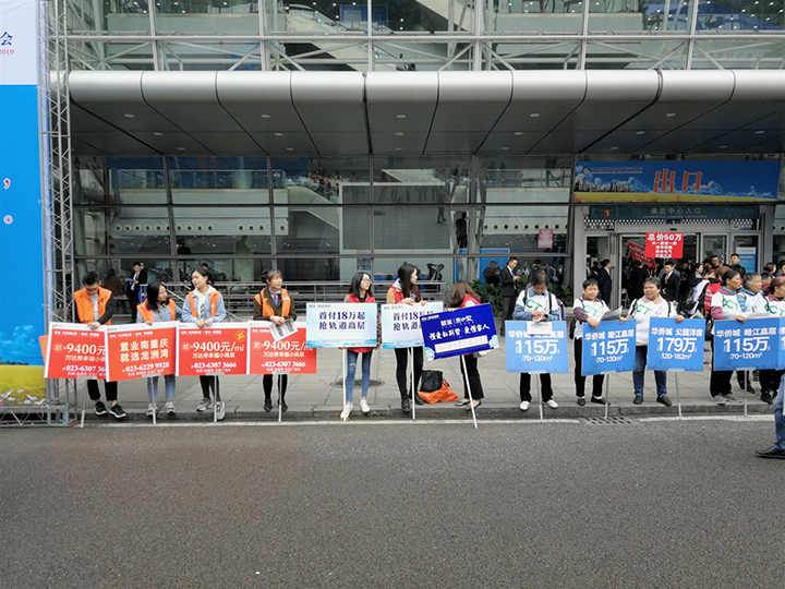 一出輕軌站,小編立馬就感受到了房交會(huì)的“狂熱”氛圍,幾乎全重慶發(fā)傳單的大媽都聚到了這里,隨處可見(jiàn)舉著廣告牌的兼職小哥和身穿西裝戴著工牌的銷售人員,不管你看起來(lái)是個(gè)身懷巨款的土豪還是像小編這樣的“三無(wú)青年”,在這里每走一步,都會(huì)有人熱情地湊上來(lái)用親切的口吻詢問(wèn)你:“帥哥,看房嗎?”