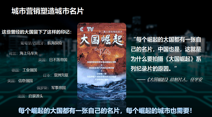《大國崛起》的任學(xué)安說“每一個(gè)崛起的大國都有一張城市名片,中國也是,這就是為什么要拍攝《大國崛起》系列紀(jì)錄片的原因”。